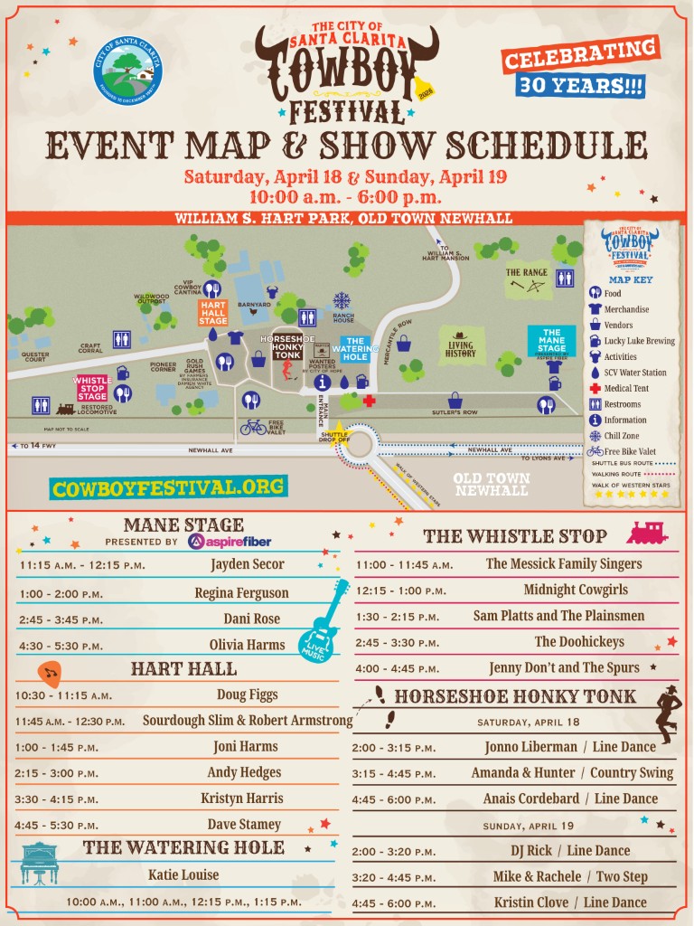Make the most of your Cowboy Festival weekend with the official event map. Find stages, food and drink, shopping, family activities, restrooms, shuttle stops, parking, first aid, and more throughout William S. Hart Park.